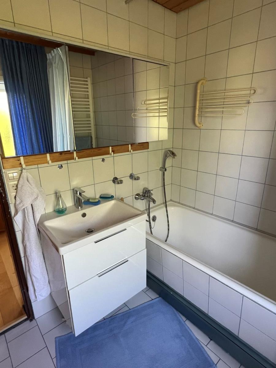 Badezimmer, Badewanne, hell gefliest, Waschtisch, Unterbauschrank, Waschmaschinenplatz, Kunststofffenster Alu erneuert