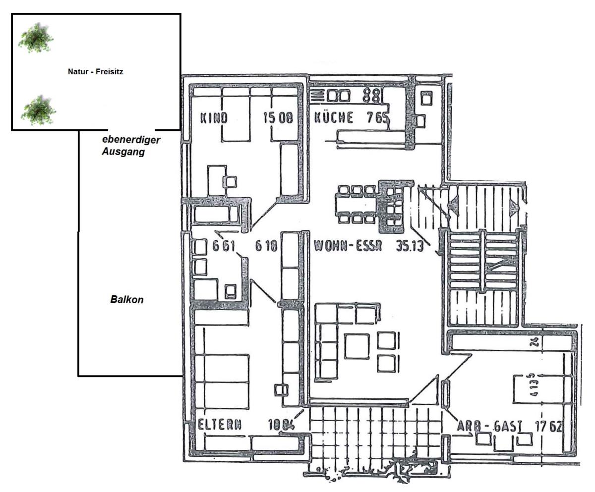 Ein weiterer Balkon auf der Giebelseite ermöglicht einen direkten Zugang zum eben angelegten Grundstück, welches vom Käufer gepflegt und genutzt werden kann, obwohl hierfür kein Sondernutzungsrecht im Grundbuch eingetragen ist.